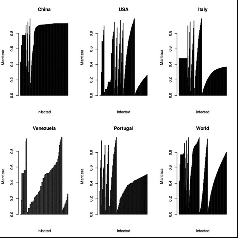 Finally, it is necessary to makea new graphic to see the changes of Covid-19’s infection in each country. To do that, we calculate the mantissa values of the register of cases according to details provided in the following section Therefore, the goal of this paper is to determine: (1) the veracity of the data based on Benford’s Law in the following countries in alphabetical order: Argentina, Australia, Brazil, Chile, China, Colombia, Germany, India, Italy, Mexico, Peru, Portugal, Spain, United States and Venezuela. (2) Calculate the value of R0 to determine whether an epidemic outbreak is occurring in a country, and (3)Present the values of the mantissa values for the various countries, ie., China, Italy, Portugal, Spain, United States, Venezuela and World.