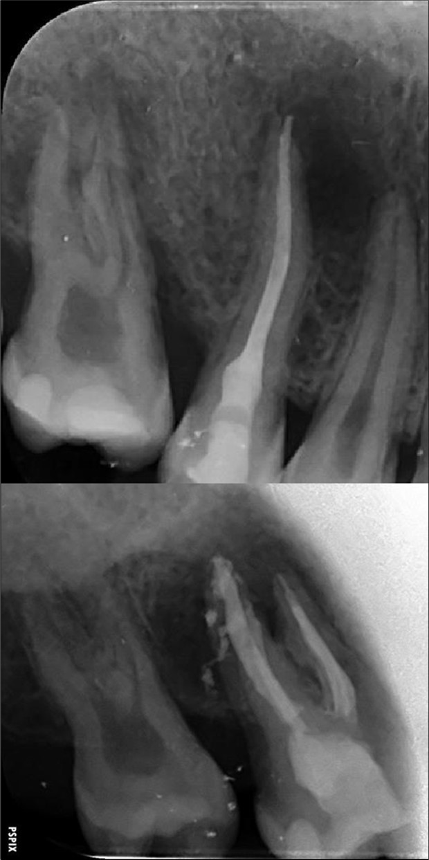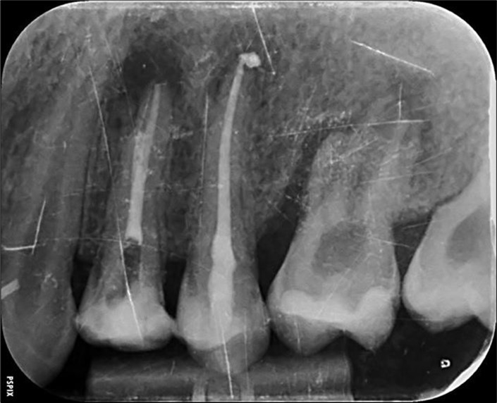 3. Endodontic root canal treatment and retreatment were performed on teeth 14, 15, 16, 25, 26, 35, 36, and 46 using a K manual file 10/30/40/50/60/70 (Dentsply-Maillefer). Hyflex Edm (Coltene) 25/06 was used for the preparation of the canals, which were irrigated with 3% sodium hypochlorite and 17% ethylenediaminetetraacetic acid. Gutta-percha were calibrated to the diameter of the root apex constriction and obturation was conducted using Endosequence Bc Sealer (Brasseler) 15.