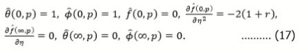 The auxiliary parameters introduced in (series solution) for the velocity profile (f), temperature distribution (θ) and concentration distribution (ϕ) are termed as convergence control parameters. These parameters are significant to speed-up the convergence. Convergence intervals are sketched in Figure 2. The interval of interest for convergence of the aforementioned profiles is (-0.60, 0.30).