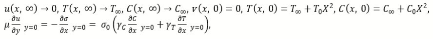 We consider a second grade nanofluid forced convection due to the Lorentz forces instigated into the model by induction of an applied Magnetic field. The effect of magnetic field develops normal to the surface upon which the fluid is flowing. The Marangoni effect is utilized to apprehend the fluid flow in forward direction. The problem is considered in two dimensions such that the fluid flows along x-axis and the y-axis extends normal to the surface. There is no fluid motion along y-axis therefore, v=0 is taken. Along x-axis the fluid undergoes the Lorentz forces that are induced into the model due to the applied magnetic field neglecting the Hall effects. The interface temperature is taken as function of x as depicted in Figure 1. The interface condition and velocity components can be visualized in Figure 1.
