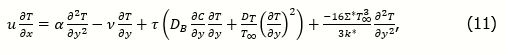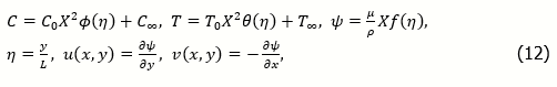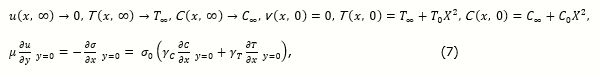 Here u, v represent the velocity components in x, y directions, respectively. μ is symbol of dynamic viscosity, v is the kinematic viscosity, ρf represents the density of fluid, K is used for chemical reaction, σ the surface tension, T0 and C0 are temperature and concentration on the surface, α is representing thermal diffusivity of the fluid, k is symbol of thermal conductivity of fluid. 𝜏 is used for ratio between heat capacity of the fluid, k is symbol of thermal conductivity of fluid. 𝜏 is used for ratio between heat capacity of the nanoparticles (PC)p and heat capacity of base fluid, (PC)f , DB is Brownian diffusion, DT is Thermophoresis, and qr is the typical radiative heat flux that can be written through Rosseland's approximation as follows: