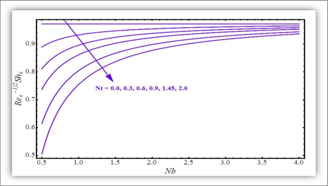 movement of nanoparticles from the surface of Riga. Figure 10 is the display of influence of radiation factor (Rd) on the temperature profile. Temperature profile receives prominent enhancement in its behavior with elevated values of radiation factor. Thus the addition of radiation factor enhances the heat flux up to a significant level. Figure 11 is plotted to analyze the behavior of concentration of nanoparticles against the variation in Brownian motion factor (Nb). The stronger Brownian motion factor enhances the in-predictive motion of fluid particles that results in enhancement of temperature distribution. This enhancement in temperature drops down the concentration of nanoparticles near the Riga surface. The concentration profile enhances with elevated values of Schmidt number (Sc) for certain reasons as shown in Figure 12. The main reason is the enhancement in Brownian diffusivity that results in enhancement of associated boundary layer of concentration of nanoparticles in the base fluid. Elevated values of both the chemical reaction and radiation factor result in decreasing behavior of the concentration profile displayed in Figure 13 and Figure 14, respectively. The enhancement in chemical reaction results in away movement of nanoparticles from the surface that ultimately effects the concentration in the base fluid. The elevated values of Thermophoretic factor (Nt) result in enhancement of heat flux but drops down the mass flux while the enhancement in Prandtl results in decreasing behavior of the Sherwood number (the mass flux) as plotted in Figure 15, Figure 16 and Figure 17.