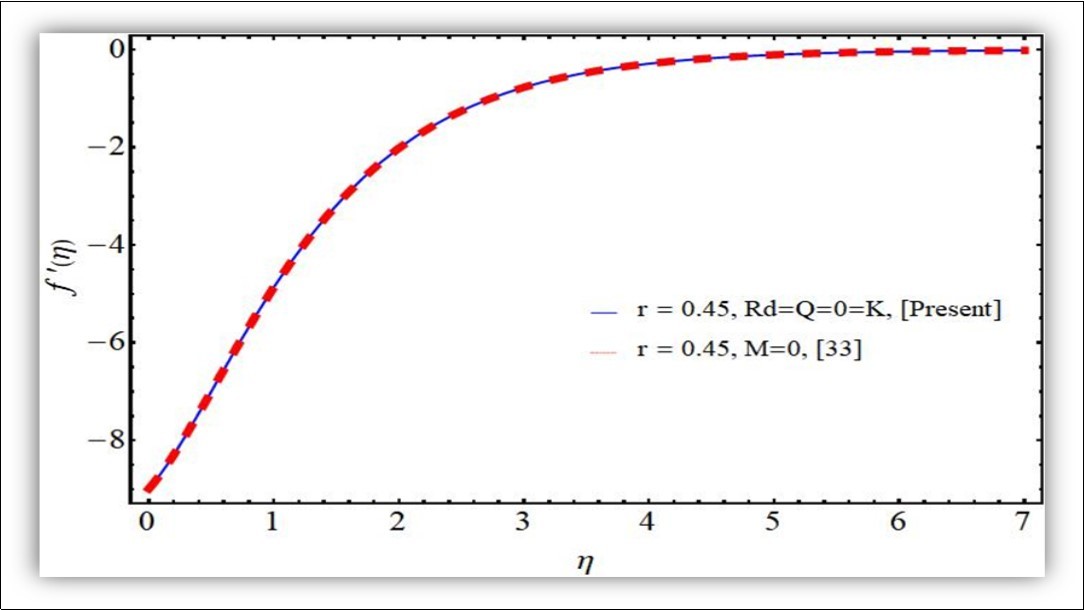This subsection summarizes the result with a precise comparison of present results with 33. Setting M=0 in 33 and Q=0=K=Rd in present model, the left over system of equations and the graphical results are exactly the same in either case as presented in Figure 18 for the velocity profile against Marangoni ratio (r). However, considering the effects of Q, K and Rd, we observe that there is a significant variation in the graphical results in the present work as compared to the previous work. For example, the elevated values of 𝜸 result in a rapid increasing behavior of velocity profile in the present case as compared to 33 confirming a more prominent effect of Marangoni ratio (r) on the flow profiles.