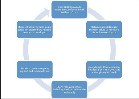 The COLLAGE 360 process (Figure 1) begins with an initial appointment, during which a directed conversation occurs and information is gathered to complete two tools, the interRAI Community Health Assessment (CHA) and the Wellness tool.(WEL) At the conclusion of this initial meeting, the coach reviews the conversation and themes with the resident and then asks them to reflect on life and personal goals prior to their next appointment. An individual’s ‘Assessment Indicator Report’ is generated prior to the next meeting. This report provides a summary of performance on age-related scales of cognitive performance, mood, function and physical activity. In addition, the potential for adverse events including re-hospitalization, functional decline, depression, social isolation and uncontrolled pain, if present, will be identified. One to 2 weeks later, at the second appointment, there is review of the resident’s reflection of their life and personal goals as well as the CHA and WEL summaries contained within the assessment indicator report. This informative discussion concludes having the resident, with support from the wellness coach, develop his/her life goals, related supporting goals, and defined action steps. The result from this interchange and discussion is summarized into a Vitality Plan, often regarded as a personalized roadmap directing one towards a higher level of wellness and quality of life. Action steps may include enrolling in an evidence-based program to promote self-management of a chronic disease, volunteering at a local community initiative, participation in a Tai Chi class or actively engaging in the planning and implementation of a social event. Once the Vitality Plan is complete, the wellness coach connects with the resident no less than once every 3 months over the course of the year to monitor the progress towards goal achievement. Full reassessments occur no less than once annually and more frequently if a major life event occurs such as a hospitalization or death of spouse or other family member.
