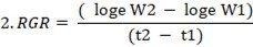Relative Growth Rate (RGR). The term was coined by 10 RGR expresses unit dry weight / unit dry weight / unit time (gg-1day-1). Where, W1and W2 are whole plant dry weight at t1 and t2 respectively t1 and t2 are time interval in days.