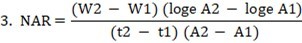 The term, NAR was used by 10. NAR is defined as rate of increase of dry weight per unit time per unit area of leaf surface (gcm-2day-1). Where, W1and W2 is dry weight of whole plant at time t1 and t2 respectively, L1 and L2 are leaf weights or leaf area at t1 and t2 respectively t1 –t2 are time interval in days.