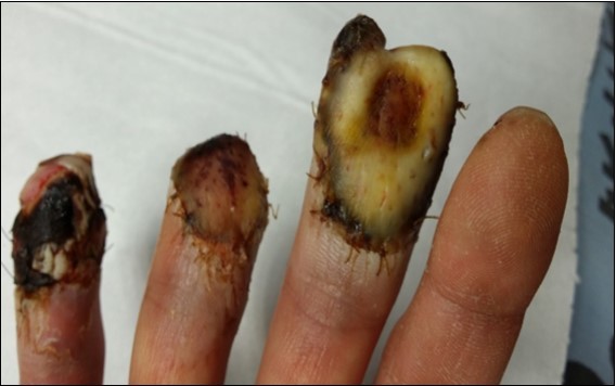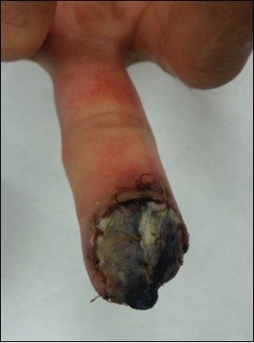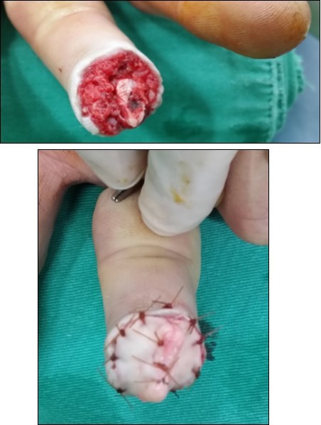 Case no. 1. 32 y/o, male. Crush injury with tip amputation of right middle finger. (Figure 1, Figure 2,Figure 3, Figure 4.)