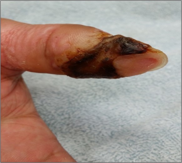 Case no. 2. 48 y/o, female. Laceration wound of right index finger; dorsal oblique soft tissue defect; nail bed defect; over DIPJ with bone and joint exposure. (Figure 5, Figure 6, Figure 7, Figure 8.)