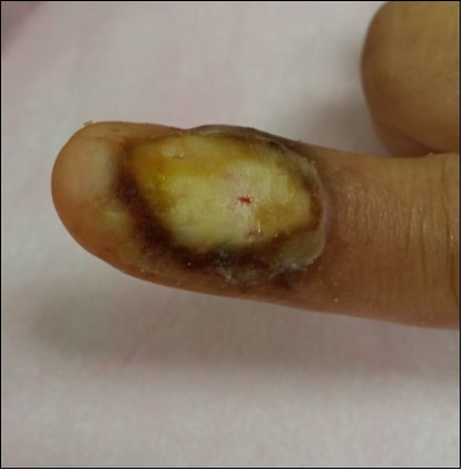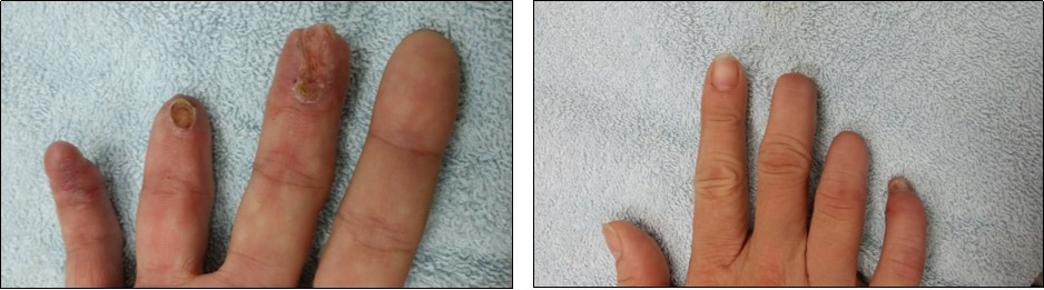 Case 6. 54 y/o male. Chemical burn, full thickness burn wound of right middle finger; tendon exposure. (Figure 19, Figure 20, Figure 21).