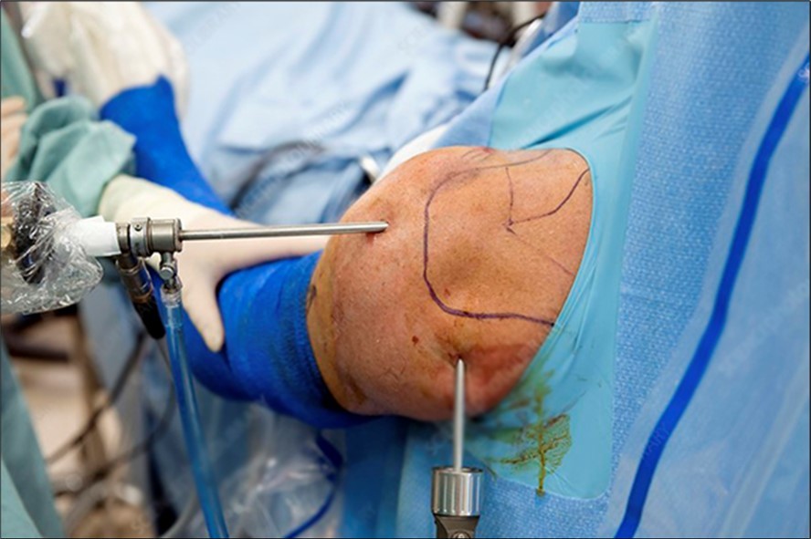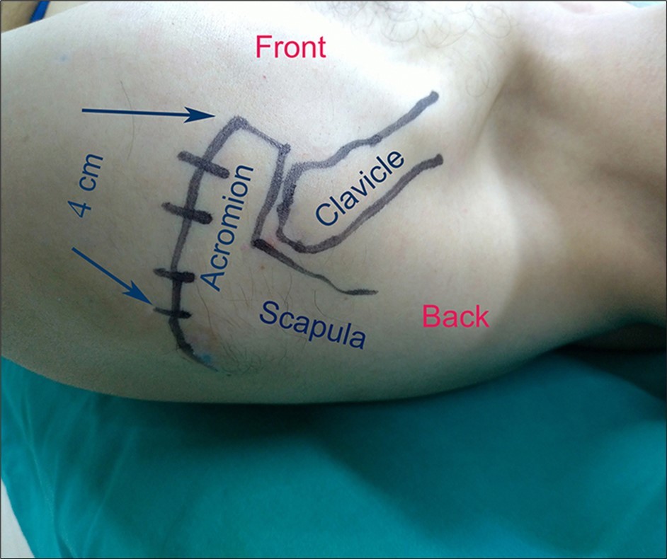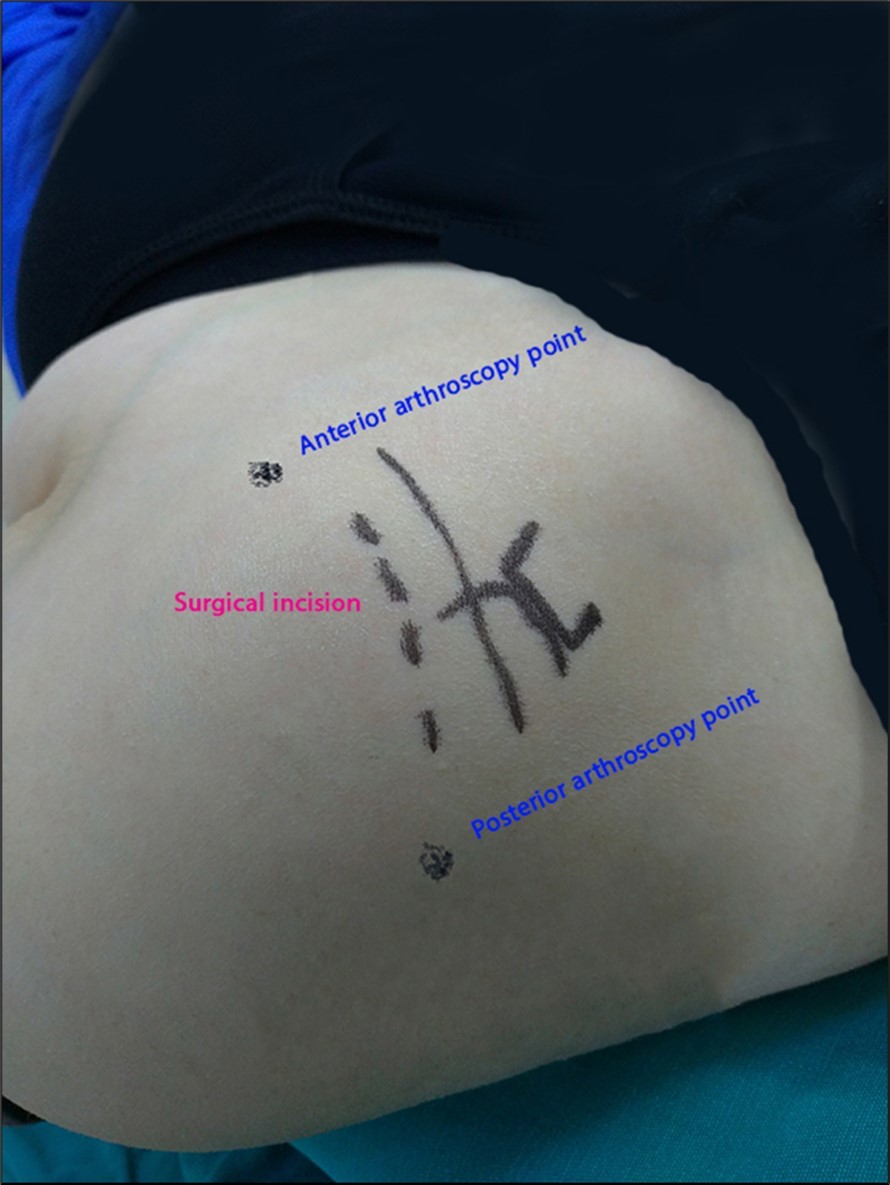 There is one arthroscopic incision on the posterior lateral edge of the acromion for the arthroscope entrance, the second entrance is for the probe, arthroscopic incisions approach is about 0.5cm. Figure 3