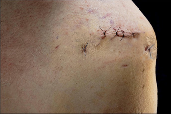 Fibrous adhesion is effective between subcutaneous tissue from one side and the acromion edge on the other side at the skin incision zone.