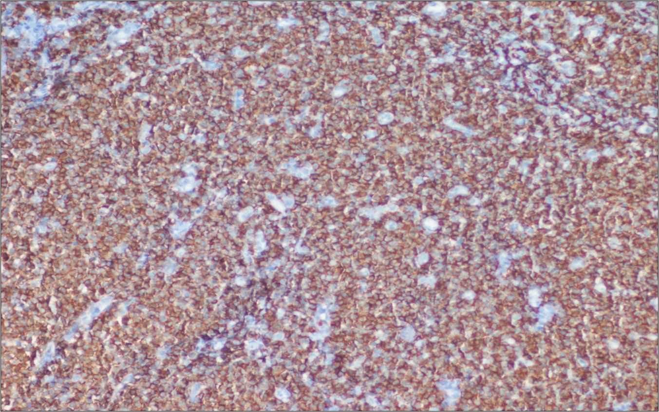 Figure 2.CD 20 positivity of lymphoid cells (CD20, x200)