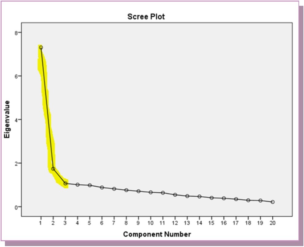 We performed an EFA without specifying the number of factors, using PCA and varimax rotation. A Kaiser-Meyer-Olkin Measure of Sampling Adequacy (KMO)’s value of .91 was generated, indicating excellent factorability. It has been advised that a KMO value should be greater than .60 and a value of >.90 is most preferable.35, 39 Although it is suggested that the sensitive-to-sample-size Bartlett's Test of Sphericity be tested only when the sample to indicator ratio is < 5:1, we wanted to check its value in our sample and found that the test was significant (Chi-square = 1,675.7, df =190, p <.001), thus favoring factorability.35, 39 Because there is no universal consensus on the best criterion to determine the number of factors in EFA, we applied 5 criteria to guide our decision-making: eigenvalues, Scree test, percentage of explained variance for each factor, cumulative percentage of explained variance, and rotated factor loadings. Table 1 shows that 4 factors are recommended, using the eigenvalue cutoff of > 1,49 while the Scree test/plot50 suggests 3 factors (an analogy is that, when you flex your elbow, the number of factors is shown starting at the elbow plus those along the forearm; see highlighted line in (Figure 1). As for the percentage of explained variance, 4 factors should be retained, as it is recommended that a factor with at least 5% of such a variance be kept.35, 39 With a recommendation for social and health science research,35, 44, 51 a cumulative percentage of explained variance of at least 50% is adequate in EFA. Thus, a 4-factor structure was determined.