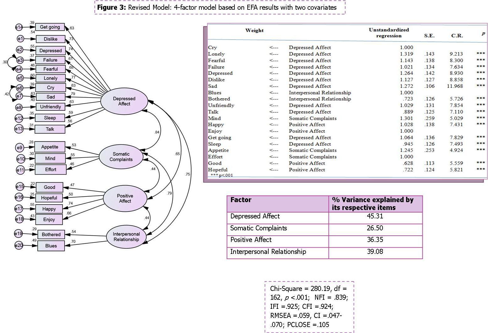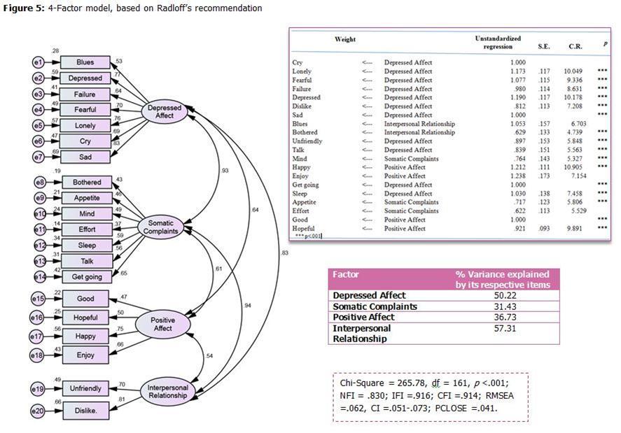 To cross-check whether or not the 4-factor structure as proposed by Radloff holds true, we constructed a visual diagram of the CES-D based on Radloff’s recommendation and ran an analysis. Results in Figure 5 revealed that 2 of the average explained variances were <50%, while the other two were >50%. Model fit indices indicate somewhat model fit (Figure 5). However, multicollinearity exists between 2 pairs of factors with a Person’s correlation of >.9043: Depressed Affect and Somatic Complaints; and Somatic Complaints and Interpersonal Relationships. The high correlation values indicate that these 3 factors measure relatively the same concept and should be restructured. Therefore, it is evident that the 4-factor CES-D model based on Radloff’s recommendation does not fit our data well.56