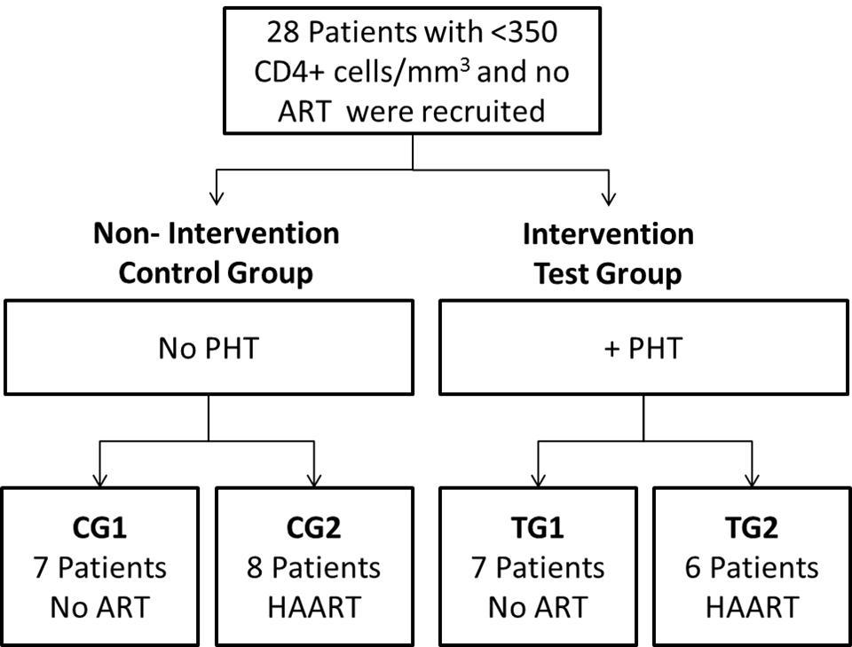 This was a prospective, controlled clinical trial designed to determine the effect of Phyto V7 supplementation on HIV-1 disease progression in HIV-infected individuals receiving or not receiving HAART. It consisted of an Intervention Test Group and a Non Intervention Control Group (Figure 1). The Test Group received Phyto V7 and was divided into 2 subgroups: with and without HAART. The Control Group did not receive Phyto V7 and was also divided into 2 subgroups: with and without HAART.