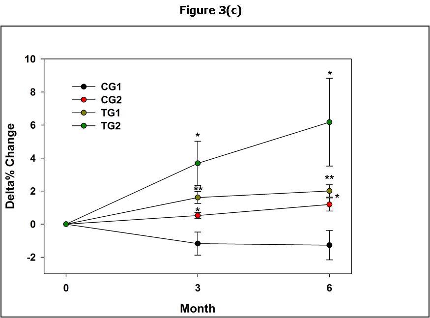 Figure 2.Changes in the patients weight from baseline at 3 and 6 months of the zommencement of the Trial. In (a) and (b) the means and standard deviations are shown. In (c) the median and standard errors are shown. * p<0.05; ** p<0.01 per group as compared to time 0.