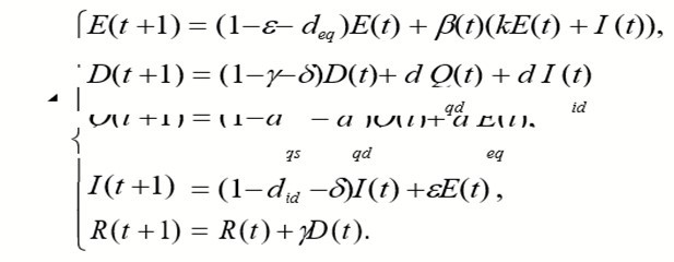 Since the incubation period of the COVID-19 is as long as 2 to 14 days, there are already infected but undetected people (E) in the natural environment of the susceptible population (S), when the first case is identified. Some people who have been infected need to go through a certain incubation period before suspected symptoms can be detected (Q). Chest CT imaging was used to observe whether there were glassy shadows in the lungs to determine whether the diagnosis was confirmed (D). Another part of the population has been infected and has been sick, because not isolated, is highly infectious in the population. After a period of quarantine treatment, these two groups of people will be discharged from hospital (R), or face death due to basic diseases, based on these, we classify the population as shown in Table 1.