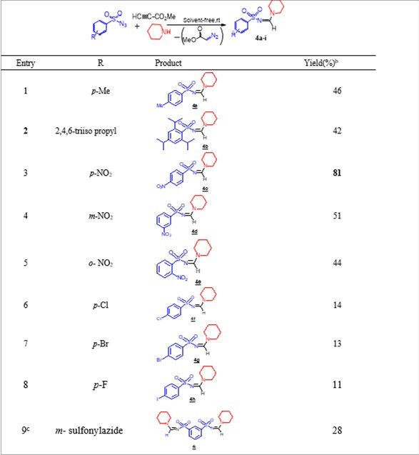 Using piperidine as nucleophilic partner, we evaluated the ability to perform the three-component reaction. This reaction sequence generated the corresponding sulfonyl amidines (4a-i) with yields ranging from 11 to 81%. The best yield was obtained from the para-nitro benzenesulfonylazide. Indeed, the para-nitro benzenesulfonylazide has a decisive influence on the successful formation of 4c (Table 3, entry 3) as 81%. The ortho-nitro and the meta-nitro benzenesulfonylazide were also examined as electron with-drawing source and gave the targeted products 4d and 4e in moderate yields (Table 3, entries 4 and 5) as 51 and 44%. The presence of either electron-donating groups (Me) or (2,4,6-triisopropyl) on benzenesulfonylazide provides almost similar yields (Table 3, entries 1 and 2) around 40%. The arenesulfonylazides containing a halogen group reacted with piperidine and methyl propiolate were unsuccessful. The corresponding products 4f-h were obtained in weak yields (Table 1, entries 6-8), with 14, 13 and 11% yields, respectively. The benzene-1,3-disulfonylazide give low yield of the desired product 4i (Table 3, entry 9) with a 28% yield.