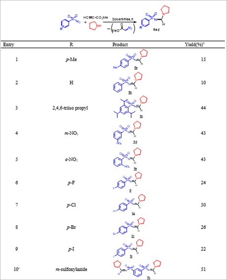 Therefore, the development of a mild, simple, fast and novel method with attractive features such as easily accessible starting materials, mild reaction conditions, and non-toxic side products to generate structural diversity sulfonyl amidines is still desirable because of their biological significance. As a continuation of our interest in developing new green synthetic methods of sulfonyl amidines,39 herein we report a facile, rapid and practical synthesis of sulfonyl amidines, potentially bioactive, via a MCR performed in air, coupling of arenesulfonylazides with methyl propiolate and secondary cyclic amines using solvent-free conditions and without requiring any catalyst or additive.