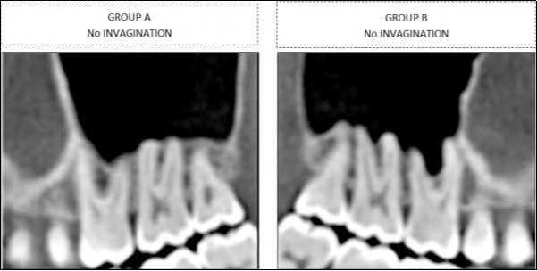 Findings for the molars were classified into two groups, depending upon whether sinus-floor invagination was present between the roots (Group B) or not (Group A) (Figure 2).