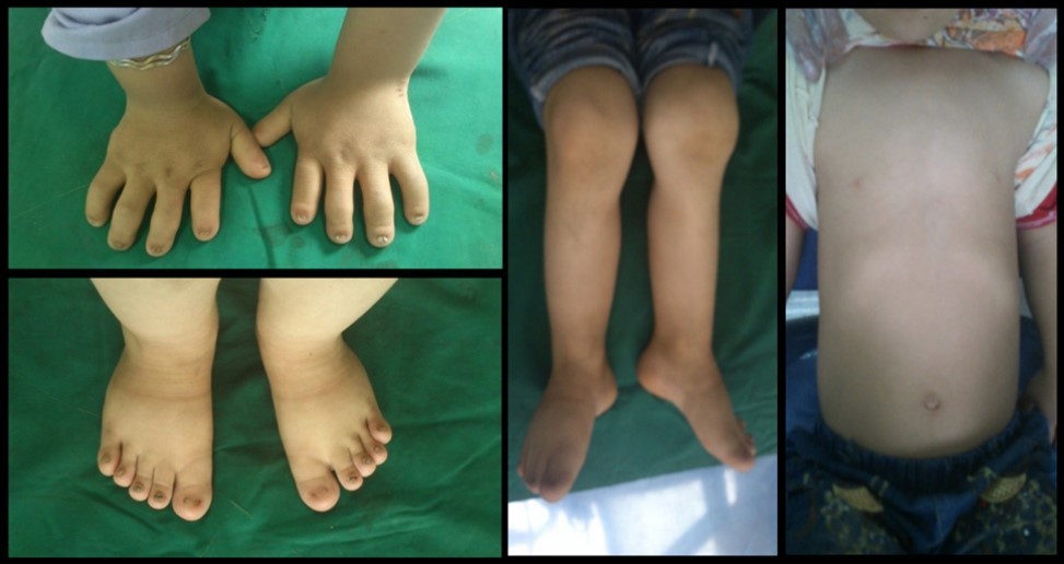 Figure 1.Organ involvement in the EVS patient: short long bones, short middle and distal phalanges, short ribs, genu valgum deformity, long narrow chest and shortness of the limbs ,hypo plastic and dystrophic finger and toe nails,