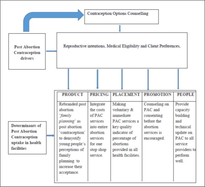 The study concludes that an integration of products, pricing, placement, promotion and people with options counselling prior to an induced abortion are key considerations for an improved post abortion contraception uptake in developing countries.