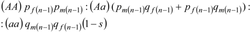 we find the sum of the genotypes frequencies in formula (3): 1 - qm(n-1)qf(n-1)s.