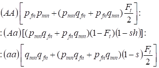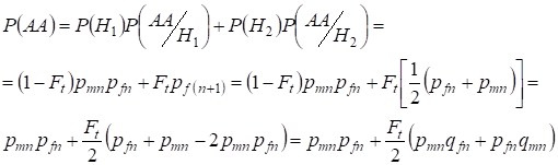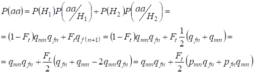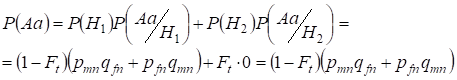 Let's find first the total probability of a heterozygote Aa occurrence, i.e. P(Aa) at the opportunity of the random consanguineous mating. This probability follows from the following logic of mating: the origin of alleles is non-consanguineous (the probability of this hypothesis is P(H1) = 1 - Ft ) also arises heterozygote Aа (conditional probability of this event is P(Aa/H1) = pmnqfn + pfnqmn, see the formula (7)) or origin of alleles is consanguineous (the probability of this hypothesis is P(H2) = Ft) and arises heterozygote Aа (conditional probability of this event is equal to zero P(Aa/H2) = 0 ). Last statement is defined by that at consanguineous origin similar alleles in homologous Х-chromosomes cannot the heterozygoteАа arise consisting different alleles.