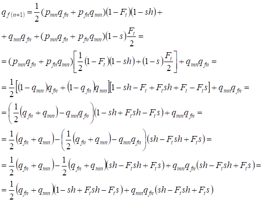 where pmn is the dominant alleles A frequency in generation n at men and pfn - at women. For the recessive alleles a accordingly qmn and qfn . Besides it is used qmn =1 - qmn and pfn = 1 - qfn.