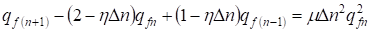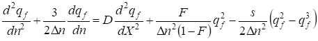The found equation is the nonlinear differential equation of the second order with square-law nonlinearity. qf = f (ς) We shall search the solution of the equation (31) as a traveling wave ς = kX - ωn (where In this case the equation (31) will be transformed to the kind: