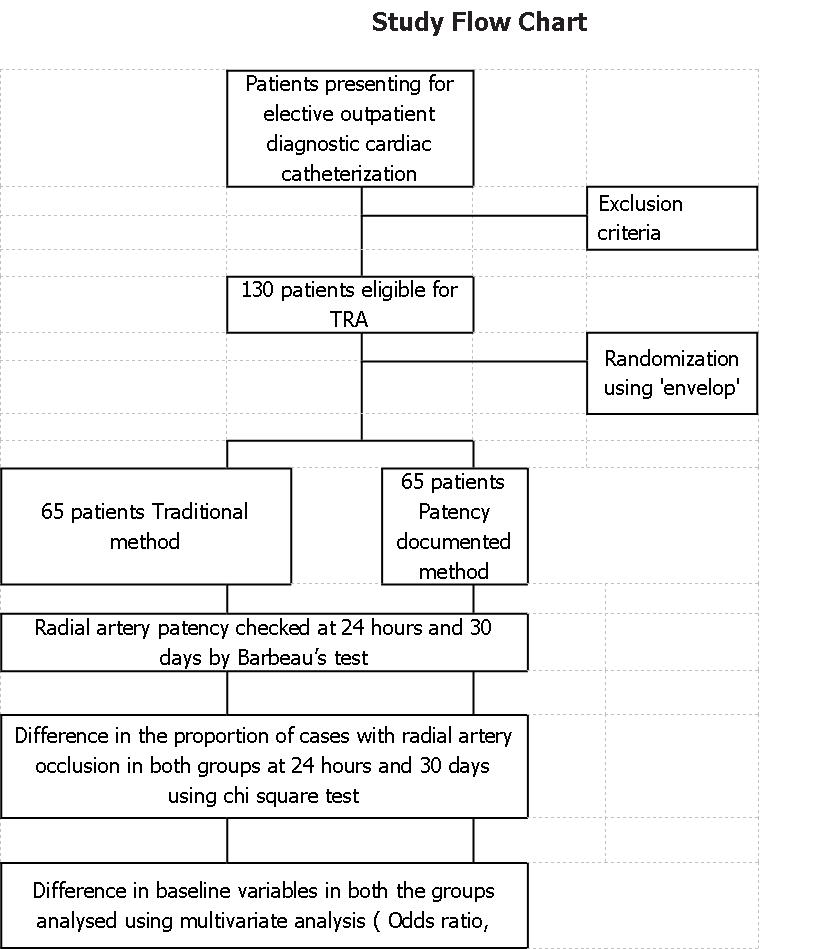 The previous year observation in our setup revealed 25% cases (61 out of 240 cases) of trans radial angiography with traditional haemostasis method developed Radial artery occlusion, we expect 4 times reduction (i.e. 6%) in occlusion rate with patency documented haemostasis method (in PROPHET study RAO rate were 7% vs. 1.8% in respective groups) (8), to verify this hypothesis at 95% confidence interval and 80% power, the required sample size would be 62 in each group. This was rounded up to 65 for our study. 130 eligible trans radial angiography cases who met the inclusion criteria were considered for study on first cum first basis. They were randomly allocated to traditional and Patency Documented Haemostasis method using ‘Envelop method’. Randomization and intervention were done by the physician other than investigator. Patients were unaware about the type of haemostasis method to which they were randomized. The first case was enrolled on 2nd April 2012, last case was enrolled on 26th February 2013, first follow up was taken on 3rd April 2012 and last follow up was taken on 28th March 2013. A Barbeau’s test was performed at baseline for presence of dual circulation and patency of palmer arch. All enrolled patients had patent dual circulation and palmer arch. Twenty-four-hour and 30-day follow-up was completed in both groups. Analysis of the outcome of all the participants was done as per their original assigned group. The techniques for traditional and ‘‘patent haemostasis’’ are described later. All patients provided informed consent. All the patients were available for complete planned follow up (30 days).