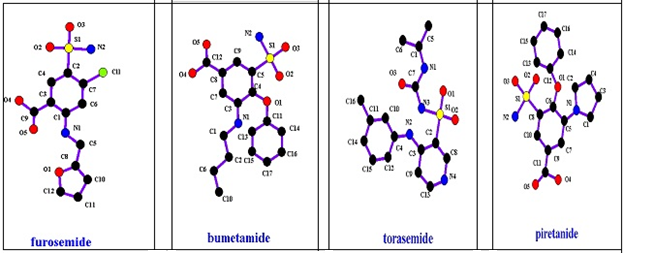 Figure 8 shows the common core structure of thiazide diuretics, and Figure 9 presents thiazide family members. Loop diuretic common core structure is presented in Figure 10; where X can be N or C, while Figure 11 presents different members of it. Table 3 presents diuretic compounds’ properties.