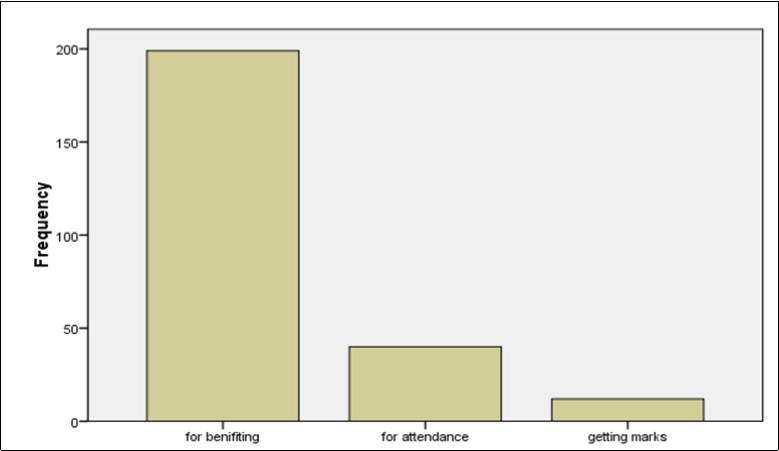 The traditional curriculum, which is basically, relies on lectures for information transfer, showed un-satisfaction among participants as shown in table 2. Participants showed poor ability to link between theoretical and practical work in case of biochemistry 26.7%, whereas anatomy and physiology were represented by 76.9% and 42.2% respectively. Integration between different disciplines of basic sciences was reported by 44.6%. Similarly, 45.8%were able to integrate between basic and clinical sciences. Most of participants depend on references as source of information. However, different reasons were considered for their attendance to laboratory work; as shown in table 3. Regarding the anatomy, the majority of students were found to attend the lab for benefits (Figure 2). Only 25.5% of participants attended the biochemistry laboratory for getting knowledge. Coverage of laboratory work to lectures was mentioned by only 13.5% of participants; and only 18.7% were able to conduct experiments in the lab by themselves. Significant correlation (p <0.05) was reported in different groups of participants regarding satisfaction of teaching methods for three disciplines, reasons for attending dissection room for getting information and skills where 100% of those in internship period, recalling for physiological information during clinical period. Also, a significant correlation was appearing in integration of theory and practical work in biochemistry discipline.