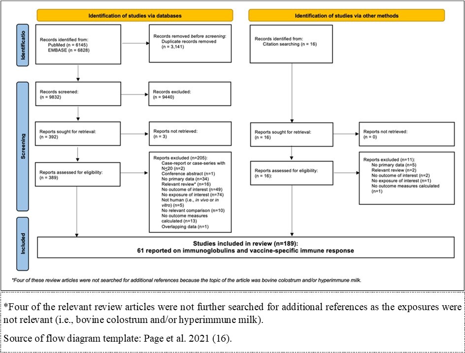 The PRISMA flow diagram describes the inclusion and exclusion of studies at each step of the review; 6145 and 6828 records were identified in PubMed and Embase, respectively (Figure 1). Using de-duplication in DistillerSR, 9382 records were screened at the title and abstract level. At the full-text level, 405 (389 references identified from title and abstract screening and 16 references identified from evaluations of relevant review articles) publications were reviewed, with 189 total references determined to be eligible. Among the 189 studies, 61 publications described the impact of dairy exposure/components on the vaccine-specific immune response and immunoglobins without vaccinations; the remaining publications examined outcomes that will be reported in future publications.