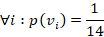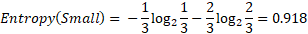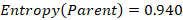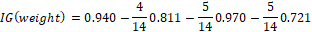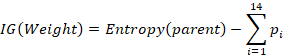Where c is the total number of splits, and p(vj) is the fraction of the records associated with a split by the total number of all the records. For an example, the weight attribute has fourteen possible values, so the number of splits c in this example is equal to fourteen, and the number of records associated to each possible value is equal to one, each attribute value has the same number of records then: