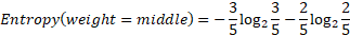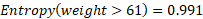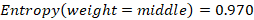 While the entropy for all the values is null, so the information gain of the “weight” attribute is equal to the entropy of the initial dataset: