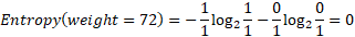 Before calculating the information gain, we must first calculate the impurity for each possible value of the “weight” attribute, the weight attribute producing fourteen values, each value linked to a single record, so that the entropy for each value will be zero. Here is an example of the value “72”, its entropy equal to: