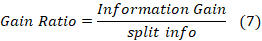 C4.5 is evolution of ID3, presented by the same author (Quinlan, 1993). The C4.5 algorithm generates a decision tree for a given dataset by recursively splitting the records. The C4.5 algorithm considers the categorical and numeric attributes. For each categorical attribute, the C4.5 calculate the information gain and select the one with the highest value, and used the attribute to produce many outcomes as the number of distinct values of this attribute 8, 9, 10. For each numeric attribute there are two methods to calculate the information gain, the first method consists in calculating the gain ratio, and the second method consists in calculating the information gain as we did in the ID3 but with some differences.