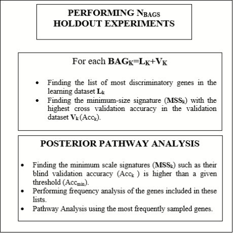 The workflow corresponding to the holdout sampler is shown in Figure 219. The holdout sampler determines for each holdout the small-scale genetic signature in the training dataset (75% of the total data) and its predictive accuracy is established using the validation dataset (25% of the total dataset). Both datasets are randomly generated in each holdout. In this case, the posterior analysis is constructed taking into account all the small-scale genetic signatures with high predictive validation accuracy. As in the previous case, the posterior analysis of the minimum size signatures found in different bags with a validation predictive accuracy higher than a given minimum predictive accuracy (85%) serves to establish the defective genetic pathways, using ontological ready platforms. The application of this methodology to sampling the defective genetic pathways in Parkinson disease compared to healthy control serves to decipher the biological processes that are involved at the level of transcriptome. The knowledge that stems from this analysis should be crucial important in drug design to palliate the effects of PD and reestablishing the homeostasis perturbed by the disease.
