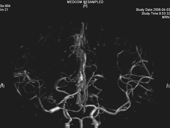 Figure 1.Lesion in the right basal ganglia displayed in the source image of MRA