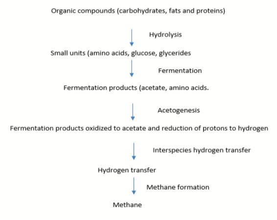 The processes yielding biogas involve anaerobiosis whereby archaea bacteria, algae, fungi, protozoa and or viruses degrade organic matter. Bio digestion has been employed to treat organic wastes to recover renewable 1011. Anaerobiosis involves a series of processes in which microbes biodegrade organic materials 1, 12. Synthesis of biogas can be coupled to waste management because it produces bio residue which serves a s manure and a gas suitable to replace fossil fuels 13, 14. The process of bio digestion starts with bacteria hydrolyzing organic matter placed in a digester to transform insoluble organic polymers like cellulose to soluble products, on which different protozoa act 13. Acetogenic bacteria convert amino acids and sugars to methane, hydrogen, carbon dioxide and ammonia 15.