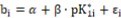 The slopes b, obtained from the series of n = 5 titrations were applied for evaluation of the true pK1 = pK1o value. Assuming the linear relation between b = bi and pK1* = pK1i*, we apply the regression equation