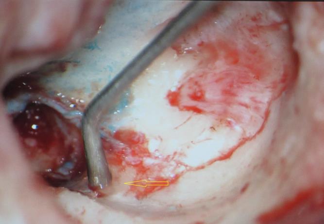 Figure 4.Arrow pointing to exposed facial nerve (vertical segment)