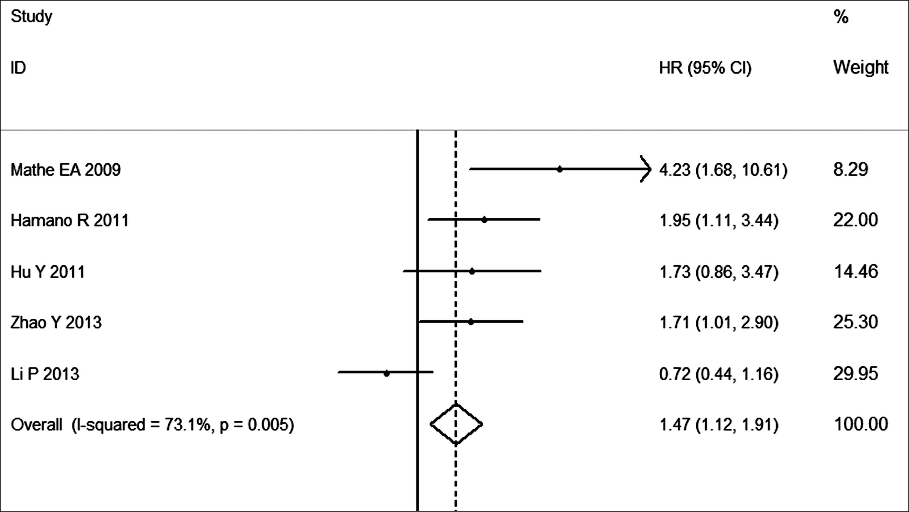 The data of 5 studies from the United States, China and Japan were collected, including a total of 579 cases of EC patients. The methods of detecting miR-21 expression are in situ hybridization, quantitative real-time PCR (qRT-PCR) and stem–loop RT-PCR. The pooled HR is 1.47, and 95% CI is 1.12–1.91. As shown in Figure 2, high expression level of miR-21 significantly predicts poor survival (P < 0.01). There was no evidence for publication bias on the funnel plot (data not shown).