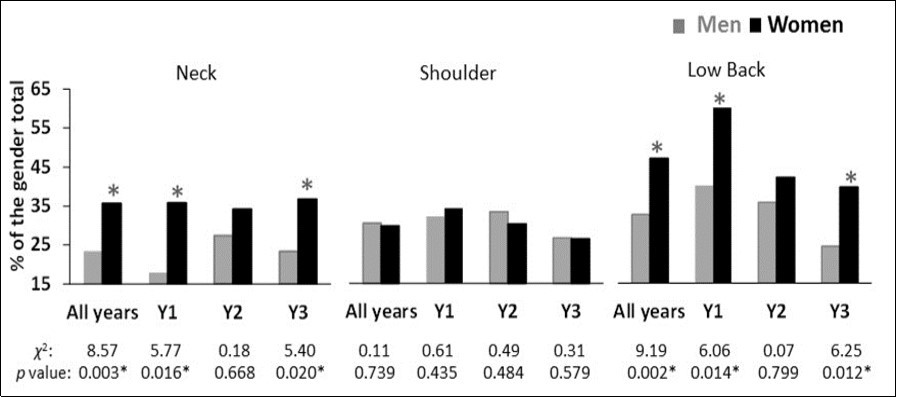 Figure 1.Gender association to pain prevalence in neck, shoulder and low back. *significant gender difference at p ≤ 0.05.