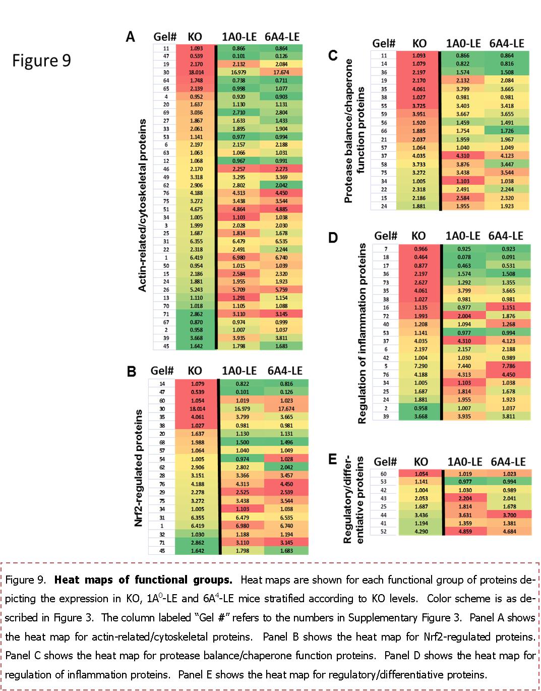Figure 9.Heat maps of functional groups. Heat maps are shown for each functional group of proteins depicting the expression in KO, 1A0-LE and 6A4-LE mice stratified according to KO levels. Color scheme is as described in Figure 3. The column labeled “Gel #” refers to the numbers in Supplementary Figure 3. Panel A shows the heat map for actin-related/cytoskeletal proteins. Panel B shows the heat map for Nrf2-regulated proteins. Panel C shows the heat map for protease balance/chaperone function proteins. Panel D shows the heat map for regulation of inflammation proteins. Panel E shows the heat map for regulatory/differentiative proteins.