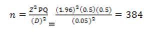 Where n= required sample size, Z is value (1.96 for 95% confidence level) and p is the estimated proportion of respondents. Then Q is (1-p), and D is the accuracy (error allowed or error in the margin). Since no large pattern has been performed in the field, P is 0.5 can be used as an approximate small sample to provide the study with excess amount.