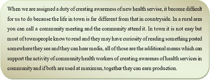 During the interview, community health workers had a quite similar view of community needsas their representative at health centers level (community health officers). They said that it is difficult to call a meeting and be attended on satisfactory level. People are busy in searching their daily family needs. In this case community health workers who are supposed to create awareness of new information of health services became obliged to go house to house and most time they find none because the home are closed. They suggest to use media and posts of everywhere. The community health workers explained in the following way: