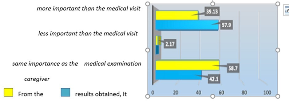 It seems that only 2% of family members consider therapy less important than a medical visit, while the rest, i.e. most of them, attribute the same importance to it as a medical visit, as do just over half of the nurses. graph 2
