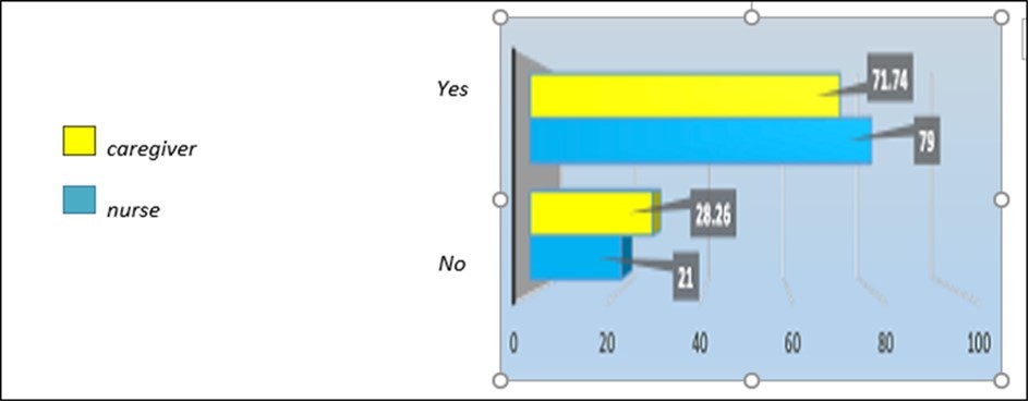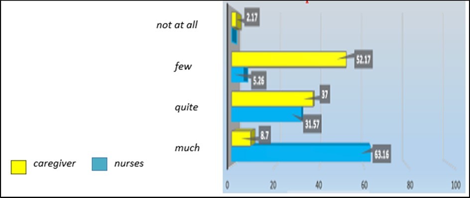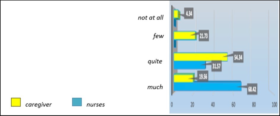 In total, a total of nineteen completed by nurses and forty-six completed by caregivers questionnaires were obtained. The data analysis is reported in the form of graphs performed with the EXCEL 2013 program.